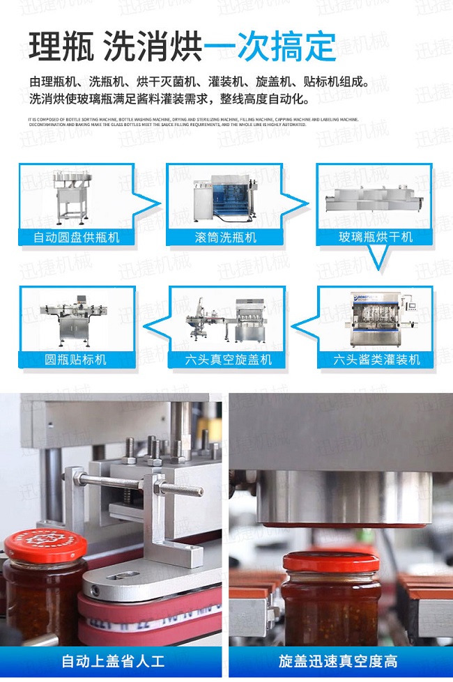 自動化醬料灌裝旋蓋貼標生產線優(yōu)勢: