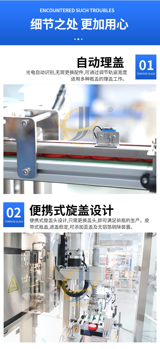跟蹤式旋蓋機是在聯(lián)機取放旋蓋機的基礎上設計的,它解決了聯(lián)機拾放旋蓋機容量低的問題,其運動由運動控制器控制,比PLC更、更準確,封蓋時,封蓋頭隨著瓶子的移動而移動。它可以配備一個或兩個封蓋頭,容量從 40B/M 到70B/M 無需考慮瓶子和蓋子的大?。ɑ?100ML到5000ML瓶子)。