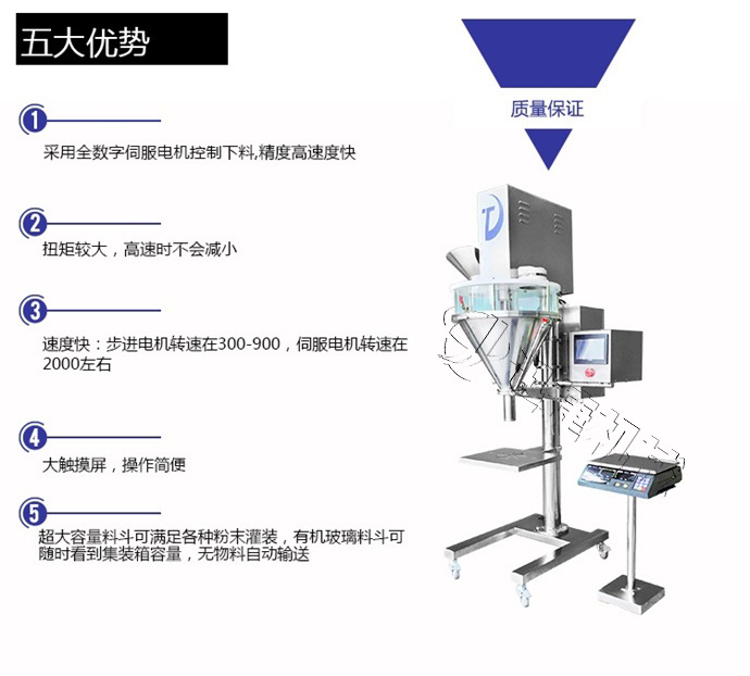 該粉劑包裝機(jī)適用于有一定流動(dòng)性的粉劑狀、顆粒狀物料,可適合袋類、罐類、瓶類等各種包裝容器粉劑定量包裝,速度快、精度高。如農(nóng)藥、獸藥、預(yù)混料、添加劑、奶粉、淀粉、調(diào)味品、酶制劑、飼料等粉劑狀、雞精、餃子粉、葡萄糖、奶粉、綠豆粉、淀粉、調(diào)味料、飼料、顆粒狀物料的定量包裝。該款半自動(dòng)粉劑包裝機(jī)在市場(chǎng)深受顧客喜愛,自然有它的優(yōu)勢(shì),該設(shè)備提高工作效率、降低生產(chǎn)成本計(jì)量準(zhǔn)確、包裝規(guī)格大小均可成品干凈整潔、粉塵不外粘機(jī)器性能穩(wěn)定、使用壽命長(zhǎng)占用空間小、操作簡(jiǎn)便、移動(dòng)方便。