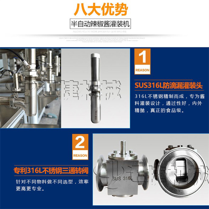 該半自動辣椒醬灌裝機適合于將各類粘稠體及含有各種固體物質(zhì)如辣椒、花生、肉塊、佐料等物體的醬類和油、料分離的火鍋底料等灌裝于各種容器中,適用于辣椒醬、顆粒醬料、大塊肉醬、火鍋底料等醬體的灌裝。