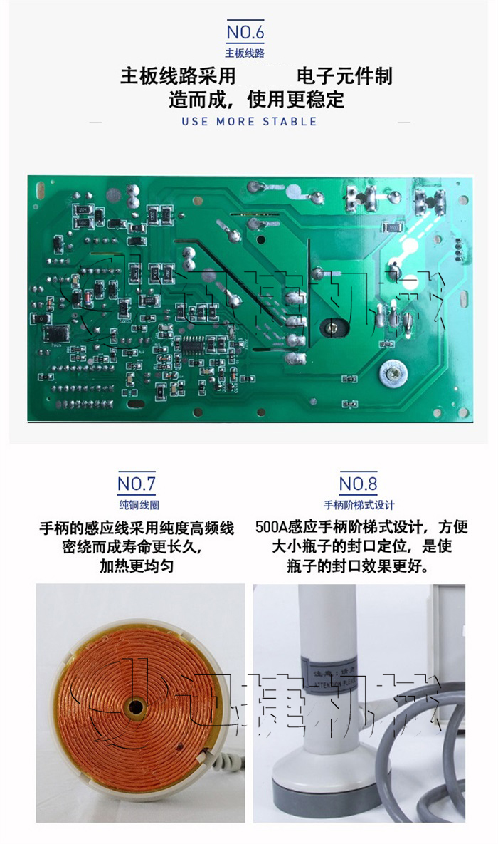 本手持式電磁感應鋁箔封口機是利用電磁感應的原理,將瓶口上的鋁箔片瞬間產(chǎn)生高熱,然后熔合在瓶口上,使達到封口的功能。具有良好的防潮、防霉、防偽作用,起到延長物品保存周期的目的。封口容器的材質(zhì)可以是聚乙(PE)、聚丙烯(PP)、聚酯(PET)、聚苯乙烯(PS)、ABS以及玻璃等,不能用于金屬瓶體及瓶蓋。(本公司同時提供各種材料感應鋁箔膜)。