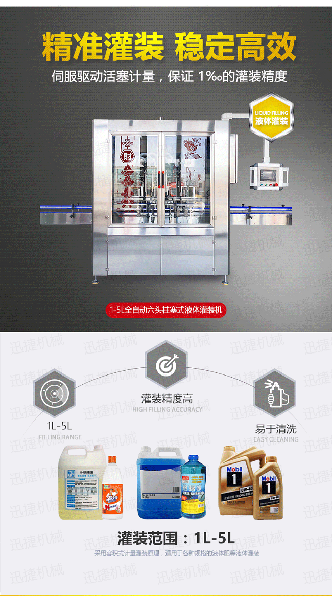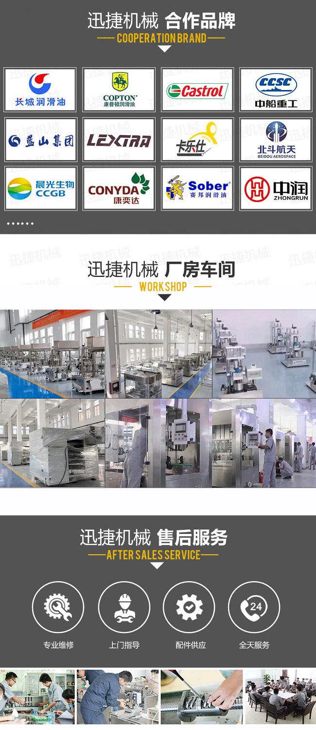 該機(jī)是我司很新研制的潤滑油定量灌裝機(jī),設(shè)備集光、電、氣于一體,由PLC配合人機(jī)界面(觸摸屏)控制,從進(jìn)瓶、定位、灌裝、出瓶等動作均全自動完成。采用直流式灌裝,與物料接觸部分均采用出色不銹鋼和食品級材料制成,符合食品衛(wèi)生要求;自動化程度高,性能穩(wěn)定,生產(chǎn)速度快,灌裝準(zhǔn)確,操作簡單、調(diào)整方便,適應(yīng)性強(qiáng)等特點(diǎn)。
