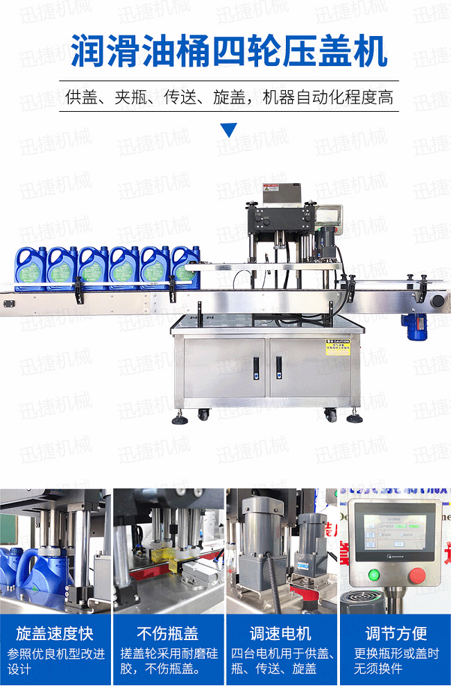 全自動(dòng)旋蓋機(jī)是參照國(guó)機(jī)型改進(jìn)設(shè)計(jì)、旋蓋速度快,合格率高、操作方便。可適用于食品、制藥、日化、農(nóng)藥、化妝品等行業(yè)的不同瓶形的旋蓋。四臺(tái)調(diào)速電機(jī)分別用于供蓋、夾瓶、傳送、旋蓋,機(jī)器自動(dòng)化程度高,穩(wěn)定性好,調(diào)節(jié)方便,更換瓶形或蓋時(shí)無須備件,只需作調(diào)整即可完成(如配上蓋機(jī),可進(jìn)行自動(dòng)上蓋)可以根據(jù)實(shí)際需要選配。
