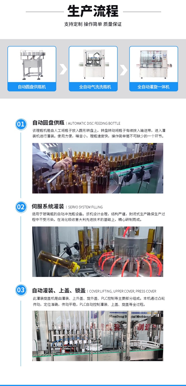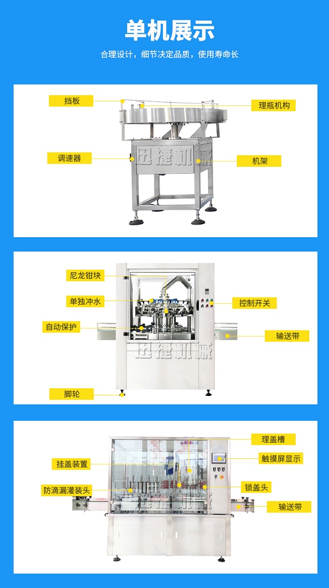 本灌裝流水線設(shè)備具有穩(wěn)定可靠、自動化水平高,相比同類產(chǎn)品有著更長的使用年限,維護(hù)簡單,整線中各設(shè)備的協(xié)調(diào)性、連貫性強(qiáng),整線設(shè)計(jì)合理等特點(diǎn)。灌裝設(shè)備采用系統(tǒng)結(jié)構(gòu),為當(dāng)今行業(yè)內(nèi)水平,整線滿足量產(chǎn)化、集成化生產(chǎn)的需要。