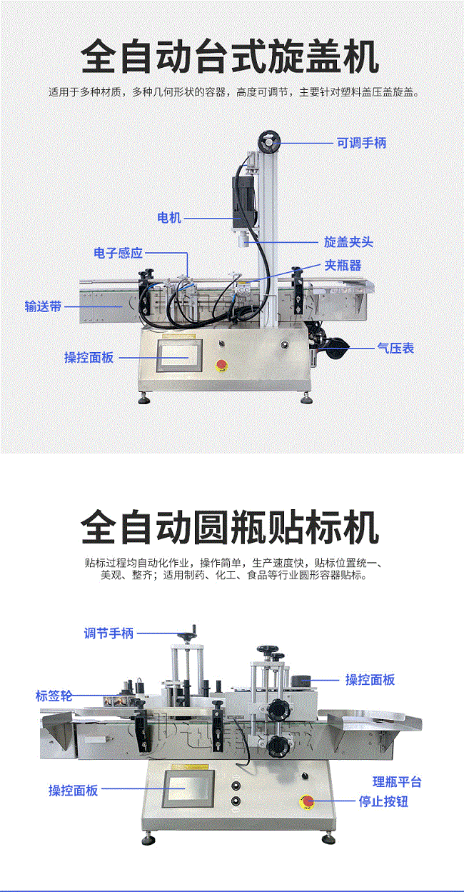 產(chǎn)品說明:生產(chǎn)線根據(jù)灌裝范圍選擇型號(hào),灌裝部分為雙頭下潛式灌裝機(jī),適用于不同物料不同瓶子的灌裝,配備自動(dòng)壓蓋機(jī)和圓瓶貼標(biāo)機(jī),可實(shí)現(xiàn)不同蓋子的旋蓋貼標(biāo)工作。
