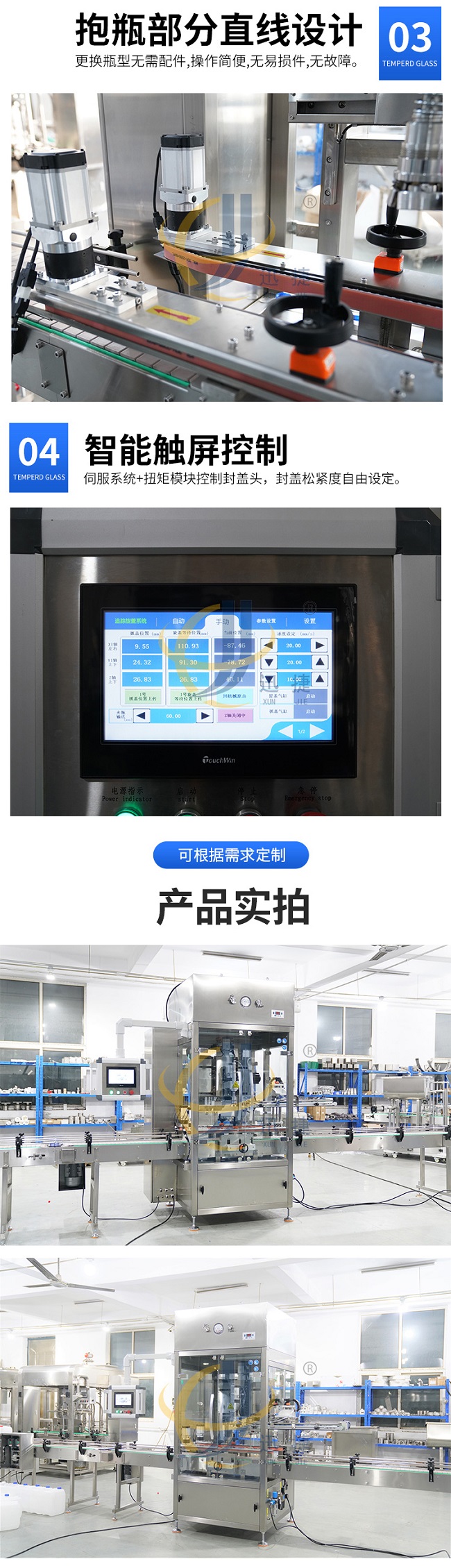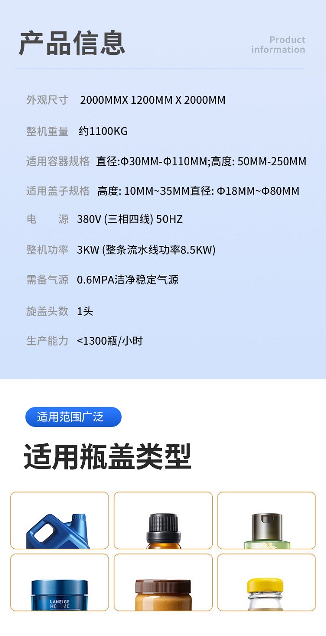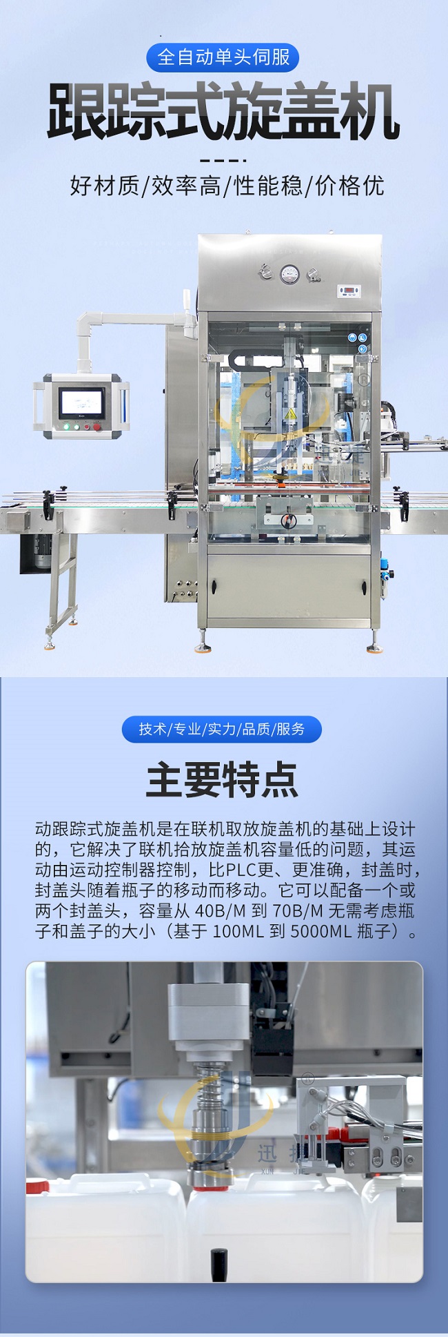 跟蹤式旋蓋機是在聯(lián)機取放旋蓋機的基礎上設計的,它解決了聯(lián)機拾放旋蓋機容量低的問題,其運動由運動控制器控制,比PLC更、更準確,封蓋時,封蓋頭隨著瓶子的移動而移動。它可以配備一個或兩個封蓋頭,容量從 40B/M 到70B/M 無需考慮瓶子和蓋子的大?。ɑ?100ML到5000ML瓶子)。