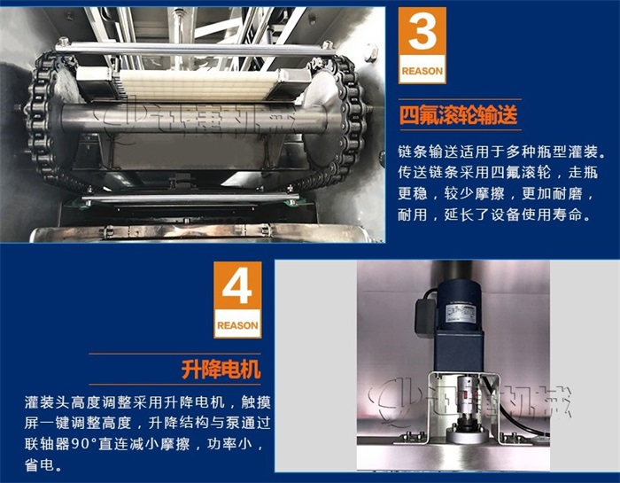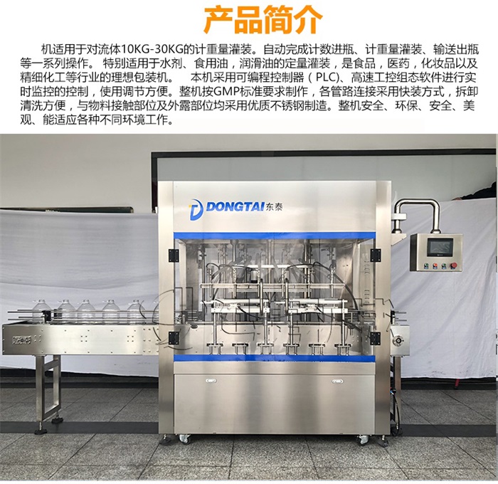 機適用于對流體5kg-30kg的計重量灌裝。自動完成計數(shù)進瓶、計重量灌裝、輸送出瓶等一系列操作。 特別適用于水劑、食用油,潤滑油的定量灌裝,是食品,醫(yī)藥,化妝品以及精細化工等行業(yè)的包裝機。本機采用可編程控制器(PLC)、高速工控組態(tài)軟件進行實時監(jiān)控的控制,使用調(diào)節(jié)方便。整機按GMP標準要求制作,各管路連接采用快裝方式,拆卸清洗方便,與物料接觸部位及外露部位均采用優(yōu)質(zhì)不銹鋼制造。整機安全、環(huán)保、安全、美觀、能適應各種不同環(huán)境工作。