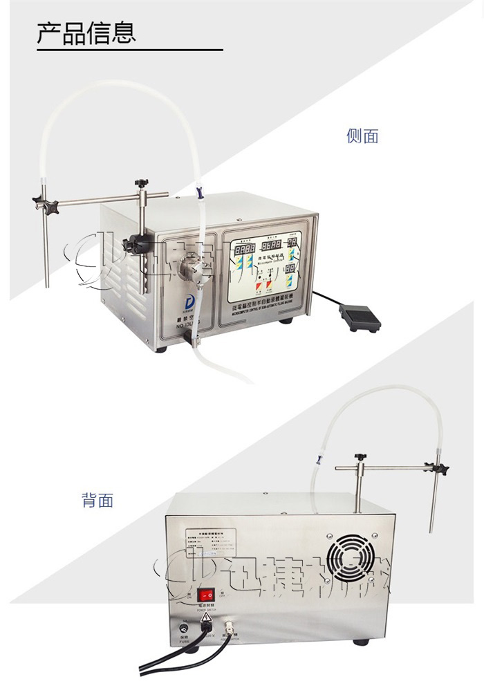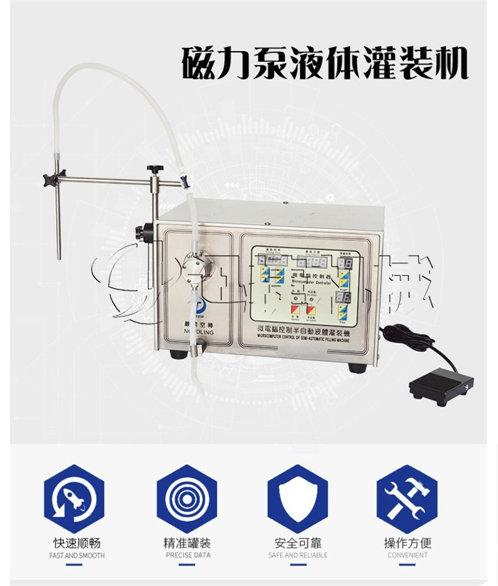 磁力泵液體灌裝機(jī)又名半自動液體灌裝機(jī),雙頭液體灌裝機(jī)等,自身采用自吸式泵及泵轉(zhuǎn)速和泵的工作時間來測定灌裝量的新型液體灌裝機(jī)。磁力泵液體灌裝機(jī)廣泛適用于化妝品、醫(yī)藥、農(nóng)藥、化工產(chǎn)品等無腐蝕性液體的灌裝。磁力泵液體灌裝機(jī)結(jié)構(gòu)簡單,操作方便。并可將出料嘴加長,皮管任意移動灌裝,能滿足5ml以上無限量(任意可調(diào))灌裝容量要求,并不受灌裝容量的限制,是一種可靠耐用的磁力泵液體灌裝機(jī)。