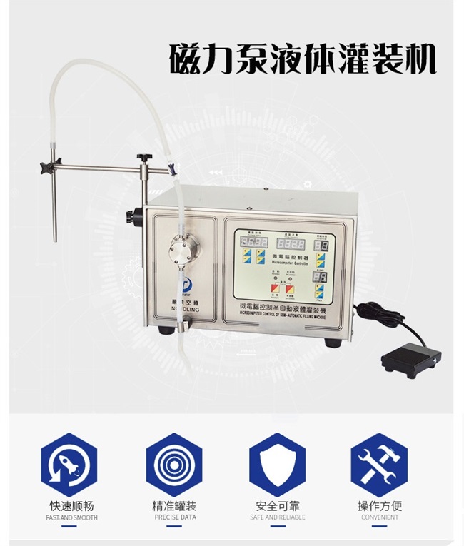 濟(jì)南迅捷設(shè)計(jì)生產(chǎn)的磁力泵灌裝機(jī)采用優(yōu)質(zhì)變頻調(diào)速器,配用進(jìn)口高精度多圈電位器及可鎖表盤,使流量調(diào)節(jié)穩(wěn)定準(zhǔn)確,誤差負(fù)偏小于0.5%,正偏小于0.5%。日本原裝進(jìn)口磁力齒輪不銹鋼泵,質(zhì)量可靠壽命長(zhǎng)。不銹鋼機(jī)箱,臺(tái)式款式,體積小,經(jīng)久耐用。操作方便,清洗消毒方便。功能全,自動(dòng)手動(dòng)均可??膳溆迷诹魉€上工作??膳涠鄠€(gè)灌裝頭,常用的型號(hào)有:?jiǎn)晤^磁力泵式灌裝機(jī),雙頭磁力泵灌裝機(jī),四頭磁力泵液體灌裝機(jī)。可灌充絕大多數(shù)類型的液體,包括高粘稠度的液體。如:各種藥劑、化學(xué)品、油類、化妝品、食品等無顆粒狀液體。灌充量從200ml-20000ml之間可調(diào),調(diào)節(jié)方便。